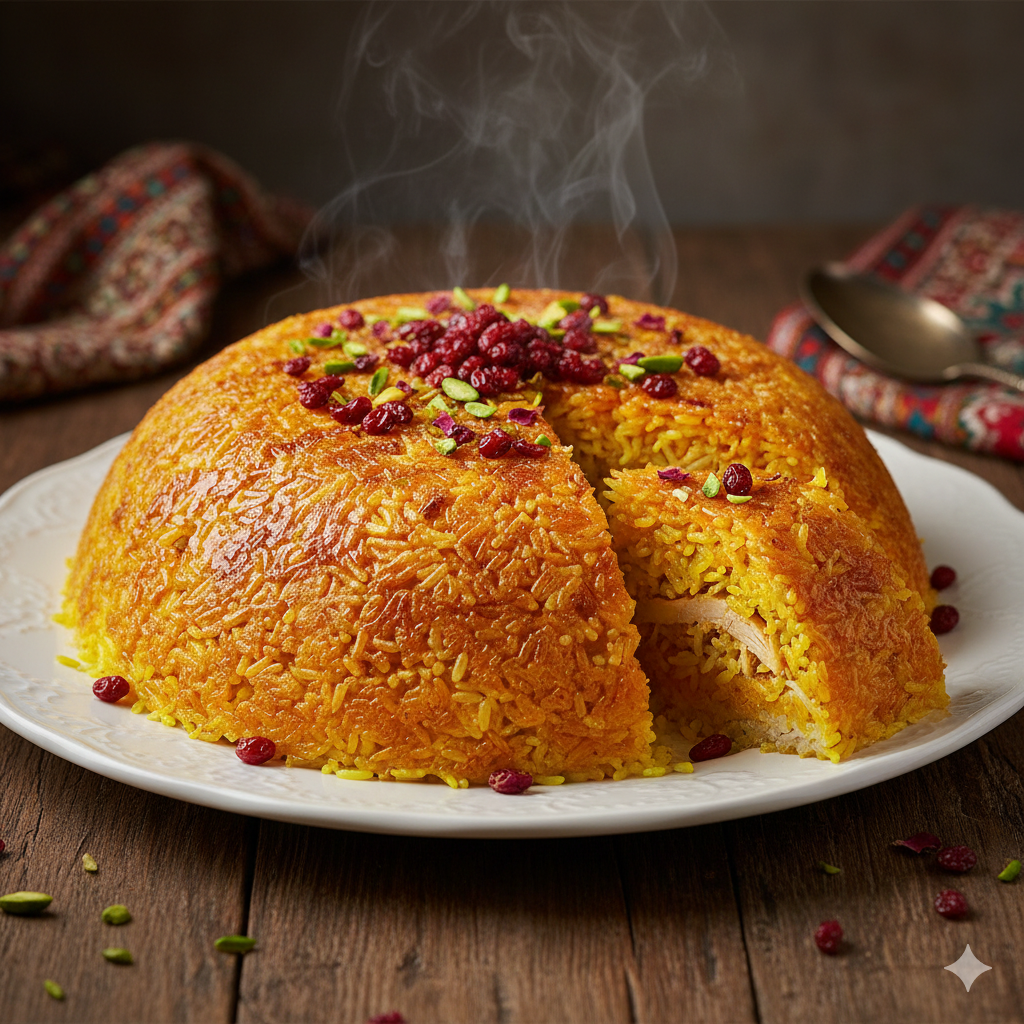 - Main Companion: Joojeh Kebab – saffron-marinated chicken that mirrors the flavours of Tahchin